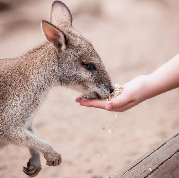캥거루, 왈라비, 에뮤에게 직접 손으로 먹이를 주거나