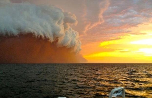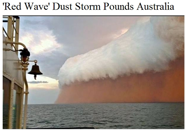 호주 신문 뉴캐슬 헤럴드에 따르면 지난 9일 저녁 호주 서부 온슬로 지역 해안에서는 무시무시한 먼지폭풍이 폭염으로 달궈진 재대지를 훑고 지난 뒤 바닷물과 만나며 만들어진 붉은 파도(Red Wave) 현상이 나타났다.